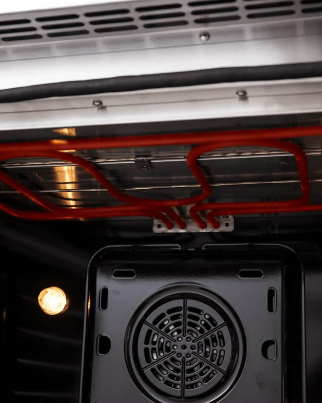 • Intérieur du four finition noire avec 2 lampes halogènes, 2 grilles de four électro-plaquées avec cadre de 7,5 mm et grille de 4 mm